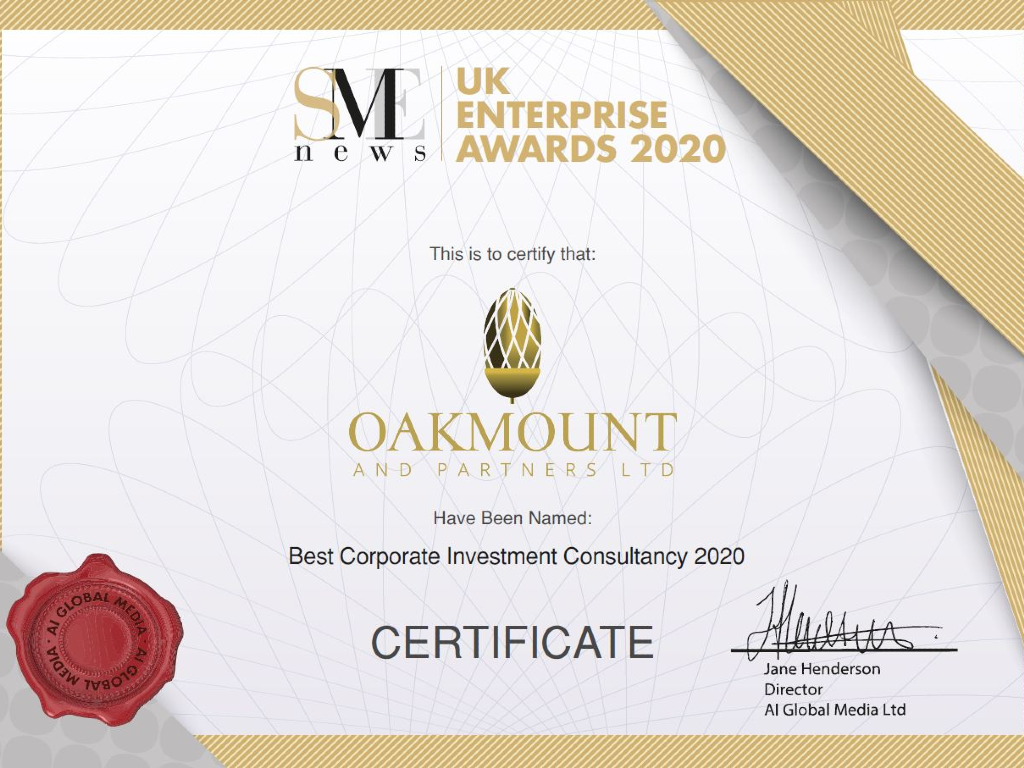 Oakmount and Partners Ltd are delighted to have been awarded and voted as the Best Corporate Investment Consultancy & Best Fixed-income & Investment Specialists 2020, by the SME UK Enterprise Awards & SME UK Finance Awards.